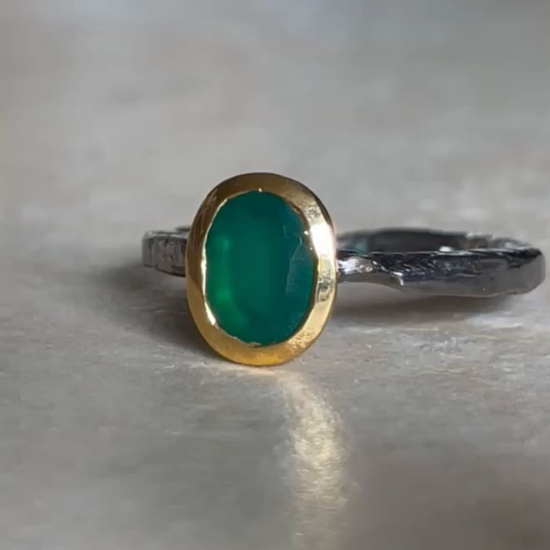 Black Rhodium and 14K Gold Plated On Solid 925 Sterling Silver Ring Natural Jade