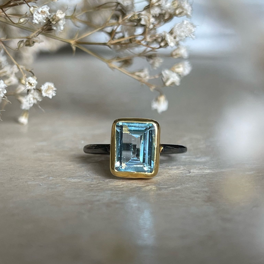 Black Rhodium and 14K Gold Plated On Solid 925 Sterling Silver Ring Blue Topaz